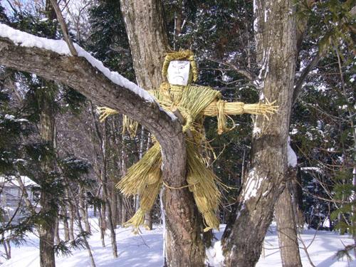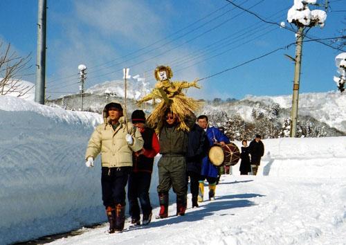 游行队伍由一个稻草娃娃领头,敲锣打鼓,并将稻草娃娃绑在树枝上,以辟邪。