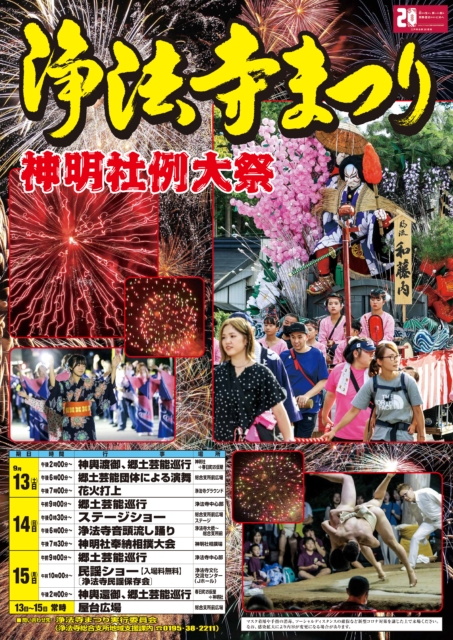 町の中心部高台にある神明社の大祭は9月中旬の3日間盛大に行われます。毎年趣向を凝らした山車が練り歩き、稚児行列や郷土芸能の七ツ物、鹿踊り(ししおどり)も人気を呼んでいます。夜には相撲の盛んな浄法寺とあって奉納相撲も行われ祭りのムードで染まります。