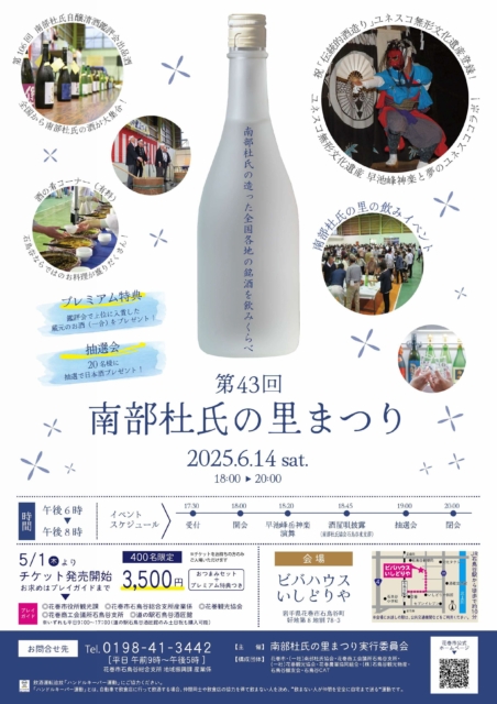 日本三大杜氏のひとつ「南部杜氏」。藩政時代より南部の酒造り340年余の歴史を担いつづけている南部杜氏発祥の地・石鳥谷(いしどりや)ならではの日本酒のまつりです。参加者は南部杜氏自醸清酒鑑評会出品酒を味わえます。