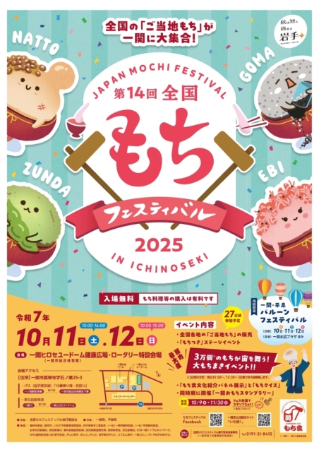 餅食文化が盛んな一関市で、日本全国のご当地餅が大集結します。全国から集まった団体が自慢の餅料理を提供します。3万個のもちが宙を舞う大もちまきイベントもあります。