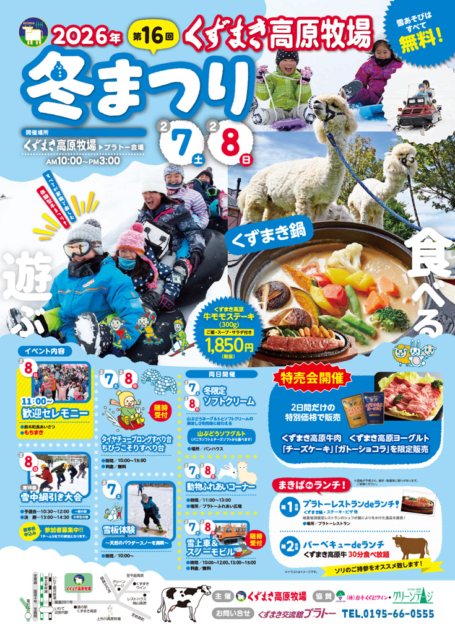 雪中綱引き大会やタイヤチューブロングすべり台、雪上車&スノーモビルなど、冬ならではの遊びがいっぱい!また、くずまき鍋や牧場ならではの温かい食べ物、飲み物の屋台もあり、冬のくずまき高原をたっぷり楽しめます。