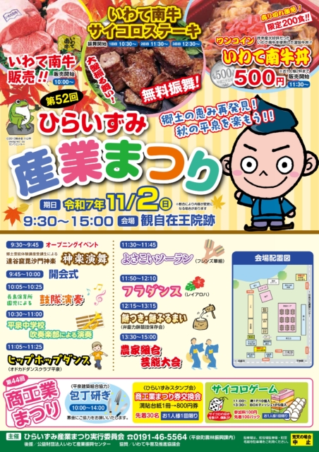 郷土の地場産品を味わう秋のイベントです。いわて南牛のサイコロステーキ無料振舞い、弁慶力餅競技保存会によるつきたてのお餅の振舞い、平泉のお肉やお米の販売、ステージイベントなど豪華な内容です。