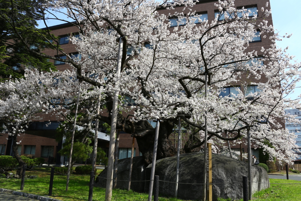 盛岡地方裁判所前に、周囲21メートルの巨大な花崗岩を割ってエドヒガンザクラが伸びています。根回り4.3メートル、高さ10メートルで、樹齢は360年以上ともいわれているこの桜は、毎年4月中旬からきれいに花を咲かせます。春の日差しそそぐ日中もきれいですが、夜桜もまた情緒があります。大正12年(1923)には国の天然記念物に指定されています。【桜の見頃】 4月中旬
