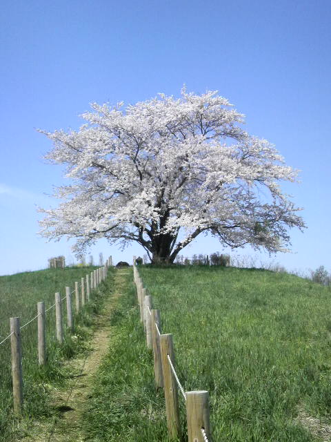 岩手山を遠くに望む小高い丘にどっしりと咲く一本桜。かつて神社のあったところで、神社移設の際、1本だけ残されたこの桜が毎年見事な花を咲かせ、人々の目を楽しませてくれています。いつ植えられたのかはわかっていませんが、ご神木だったと考えられます。晴れた日には、青空とのコントラストが絶景!