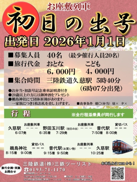 路線從三陸鐵道的久慈站出發,在野田玉川崇拜第一次日出,並在富代村的宇鳥神社進行第一次朝聖。 回程列車上提供小吃。 [申請人數] 30人(最少20人) [集合時間] 三陸鐵道久慈站 5:40(6:07出發) [旅行費用] 成人5,200日元,兒童3,700日元 *包括票價和小吃 [申請] 三越觀光總公司 0193-71-1170(平日 10:00~17:30)